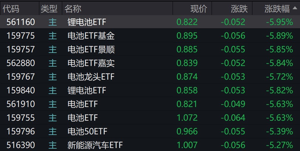受盤面影響,多只電池相關(guān)ETF跌超5%。