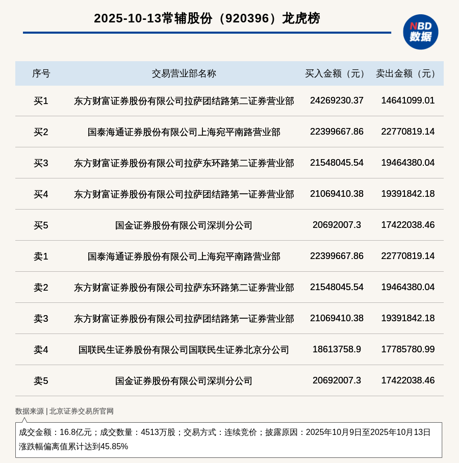 每經(jīng)訊,2025年10月13日,北交所上市公司常輔股份(920396,收盤價(jià):41元)登上龍虎榜,交易方式是連續(xù)競(jìng)價(jià),披露原因是2025年10月9日至2025年10月13日漲跌幅偏離值累計(jì)達(dá)到45.85%,成交數(shù)量4513萬股,成交金額16.8億元。買一席位為東方財(cái)富證券股份有限公司拉薩團(tuán)結(jié)路第二證券營(yíng)業(yè)部,買入2426.92萬元;賣一席位為國(guó)泰海通證券股份有限公司上海宛平南路營(yíng)業(yè)部,賣出2277.08萬元。