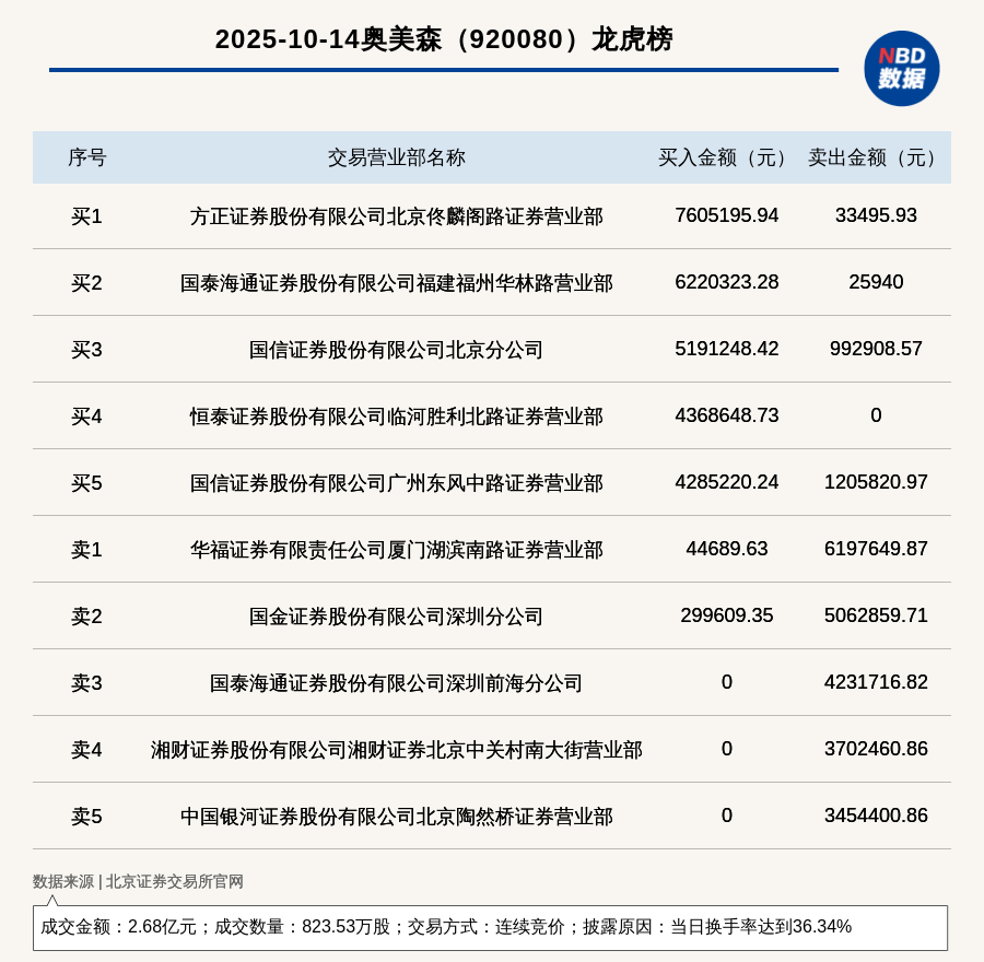 每經(jīng)訊,2025年10月14日,北交所上市公司奧美森(920080,收盤價(jià):31.7元)登上龍虎榜,交易方式是連續(xù)競價(jià),披露原因是當(dāng)日換手率達(dá)到36.34%,成交數(shù)量823.53萬股,成交金額2.68億元。買一席位為方正證券股份有限公司北京佟麟閣路證券營業(yè)部,買入760.52萬元;賣一席位為華福證券有限責(zé)任公司廈門湖濱南路證券營業(yè)部,賣出619.76萬元。