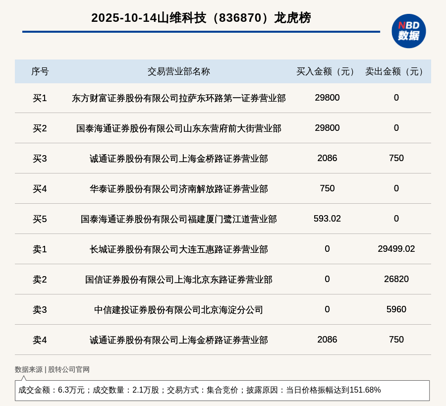 每經(jīng)訊,2025年10月14日,新三板創(chuàng)新層公司山維科技(836870,收盤價:2.98元)登上龍虎榜,交易方式是集合競價,披露原因是當日價格振幅達到151.68%,成交數(shù)量2.1萬股,成交金額6.3萬元。買一席位為東方財富證券股份有限公司拉薩東環(huán)路第一證券營業(yè)部,買入2.98萬元;賣一席位為長城證券股份有限公司大連五惠路證券營業(yè)部,賣出2.95萬元。