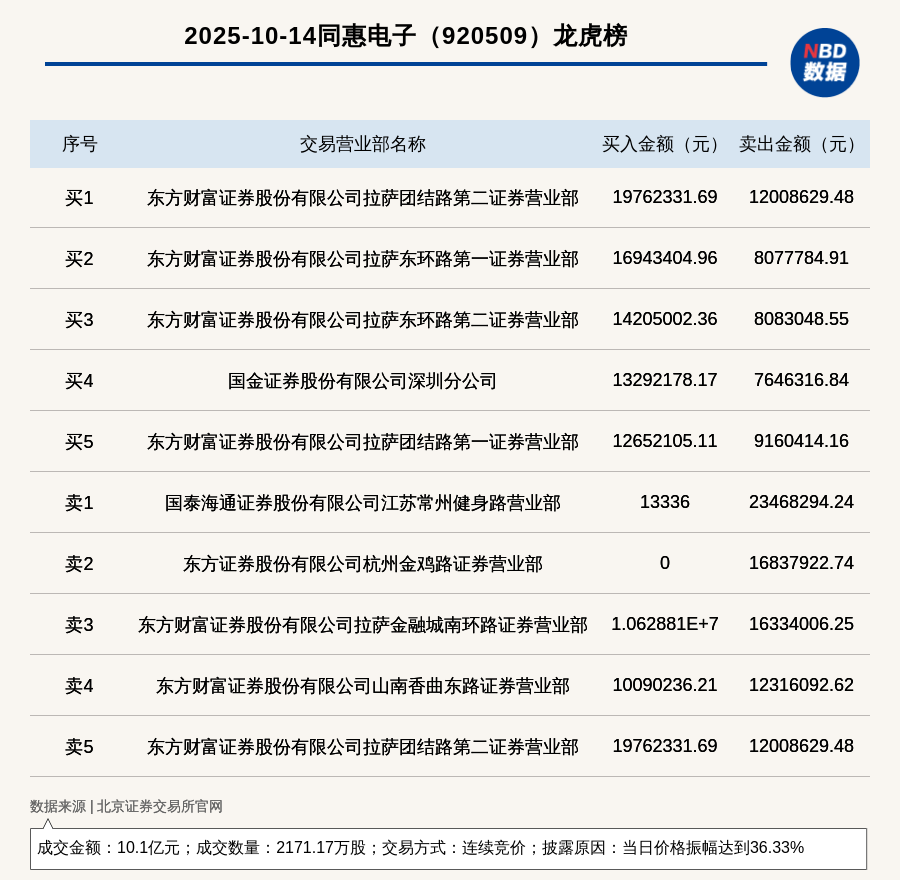 每經(jīng)訊,2025年10月14日,北交所上市公司同惠電子(920509,收盤價(jià):47.77元)登上龍虎榜,交易方式是連續(xù)競價(jià),披露原因是當(dāng)日價(jià)格振幅達(dá)到36.33%,成交數(shù)量2171.17萬股,成交金額10.1億元。買一席位為東方財(cái)富證券股份有限公司拉薩團(tuán)結(jié)路第二證券營業(yè)部,買入1976.23萬元;賣一席位為國泰海通證券股份有限公司江蘇常州健身路營業(yè)部,賣出2346.83萬元。