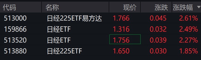 受盤面影響,多只日經(jīng)225相關(guān)ETF漲超2%。