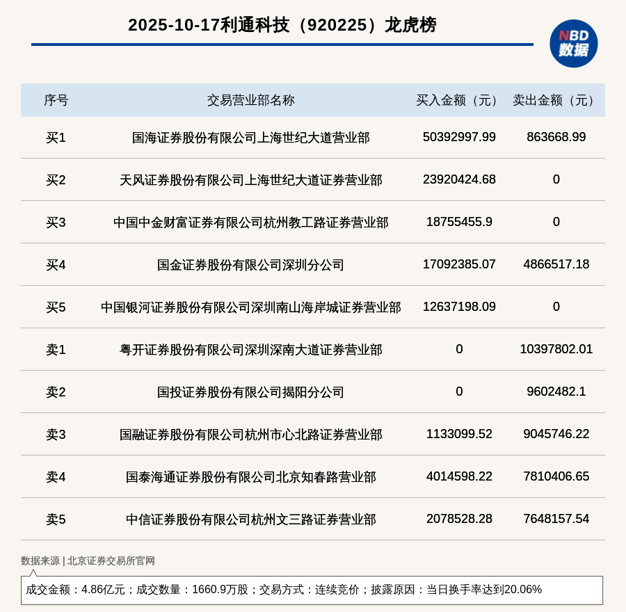 每經(jīng)訊,2025年10月17日,北交所上市公司利通科技(920225,收盤價:31元)登上龍虎榜,交易方式是連續(xù)競價,披露原因是當(dāng)日換手率達(dá)到20.06%,成交數(shù)量1660.9萬股,成交金額4.86億元。買一席位為國海證券股份有限公司上海世紀(jì)大道營業(yè)部,買入5039.3萬元;賣一席位為粵開證券股份有限公司深圳深南大道證券營業(yè)部,賣出1039.78萬元。