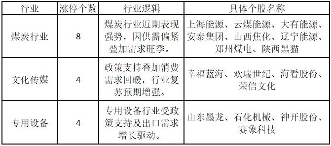 從行業(yè)特征來看,今日漲停板個(gè)股中,煤炭行業(yè)、文化傳媒、專用設(shè)備行業(yè)的個(gè)股最多。