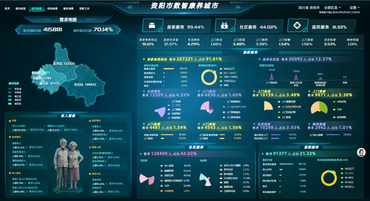 資陽的“數(shù)智化”養(yǎng)老探索不止于硬件。今年4月發(fā)布的《資陽市數(shù)智康養(yǎng)城市建設(shè)實施方案》顯示,資陽市正不斷以智能化賦能養(yǎng)老服務(wù)升級,打造“數(shù)智康養(yǎng)”平臺,并構(gòu)建起“線上智慧平臺 + 線下服務(wù)網(wǎng)絡(luò)”的一體化體系。通過技術(shù)賦能,正逐步建立起一張全天候的老年安全健康防護網(wǎng)。