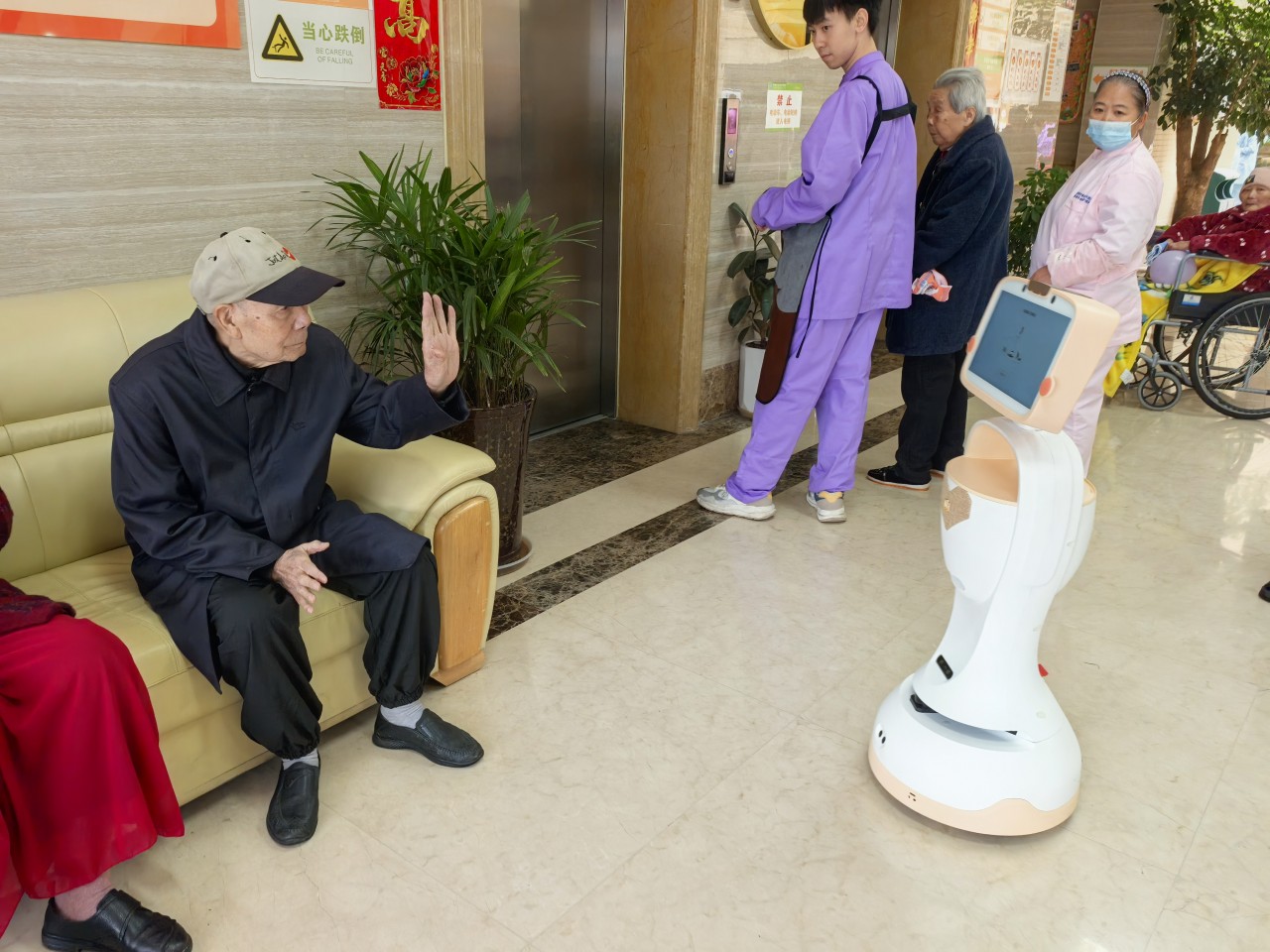 資陽市第四人民醫(yī)院內(nèi),智能養(yǎng)老機器人與老人互動。