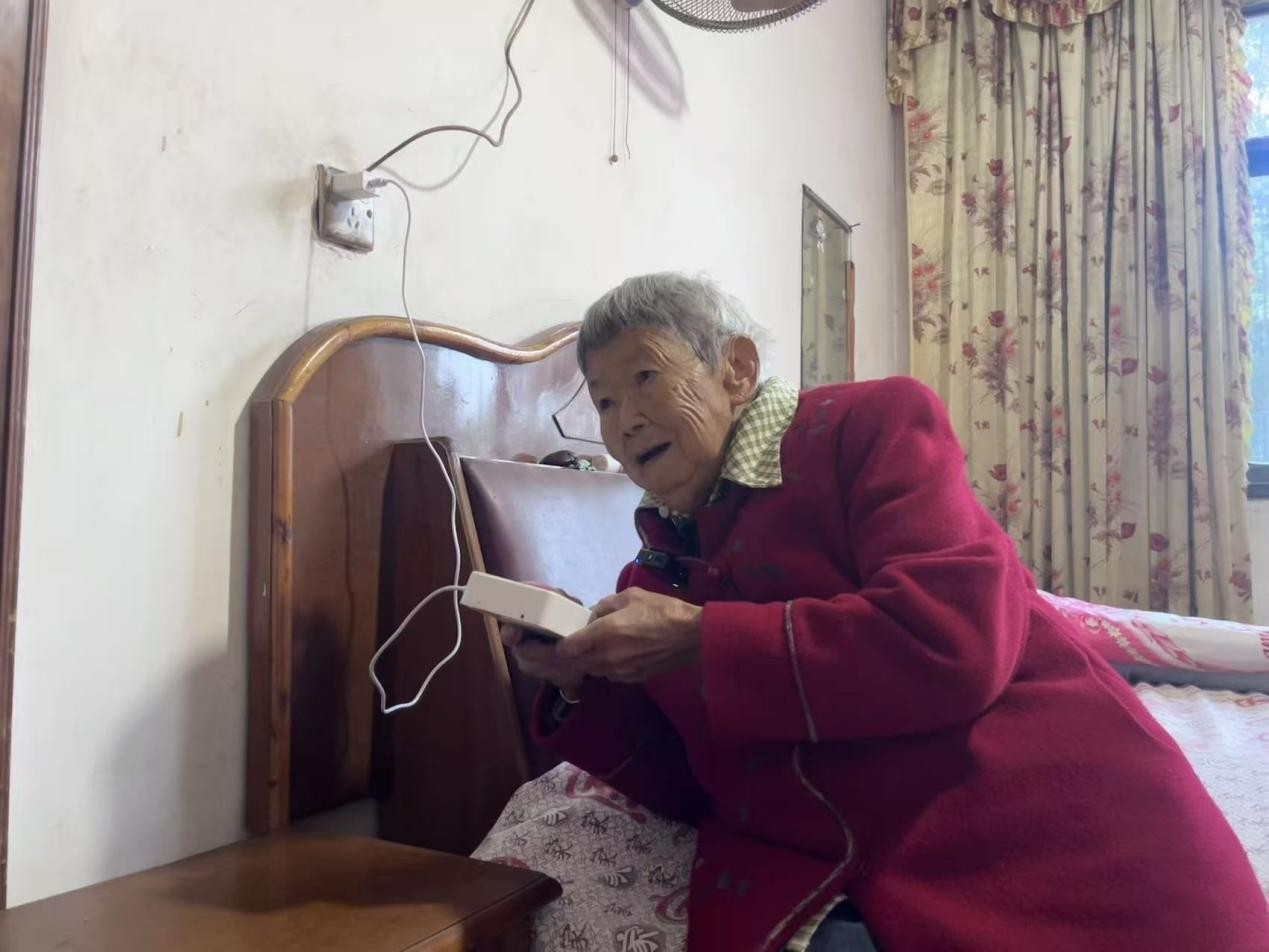 老人使用新安裝的一件報警器。全媒體記者 肖子涵 攝