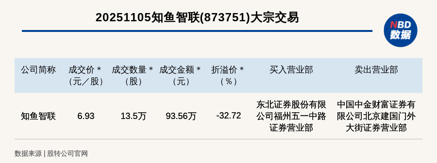 每經(jīng)訊,2025年11月5日,新三板創(chuàng)新層公司知魚智聯(lián)(873751,收盤價(jià):10.3元)發(fā)生一筆大宗交易,成交價(jià)6.93元/股,成交數(shù)量13.5萬股,成交金額93.56萬元,折價(jià)32.72%。買入營業(yè)部是東北證券股份有限公司福州五一中路證券營業(yè)部,賣出營業(yè)部是中國中金財(cái)富證券有限公司北京建國門外大街證券營業(yè)部。