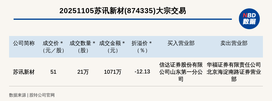 每經(jīng)訊,2025年11月5日,新三板創(chuàng)新層公司蘇訊新材(874335,收盤價:58.04元)發(fā)生一筆大宗交易,成交價51元/股,成交數(shù)量21萬股,成交金額1071萬元,折價12.13%。買入營業(yè)部是信達證券股份有限公司山東第一分公司,賣出營業(yè)部是華福證券有限責(zé)任公司北京海淀南路證券營業(yè)部。