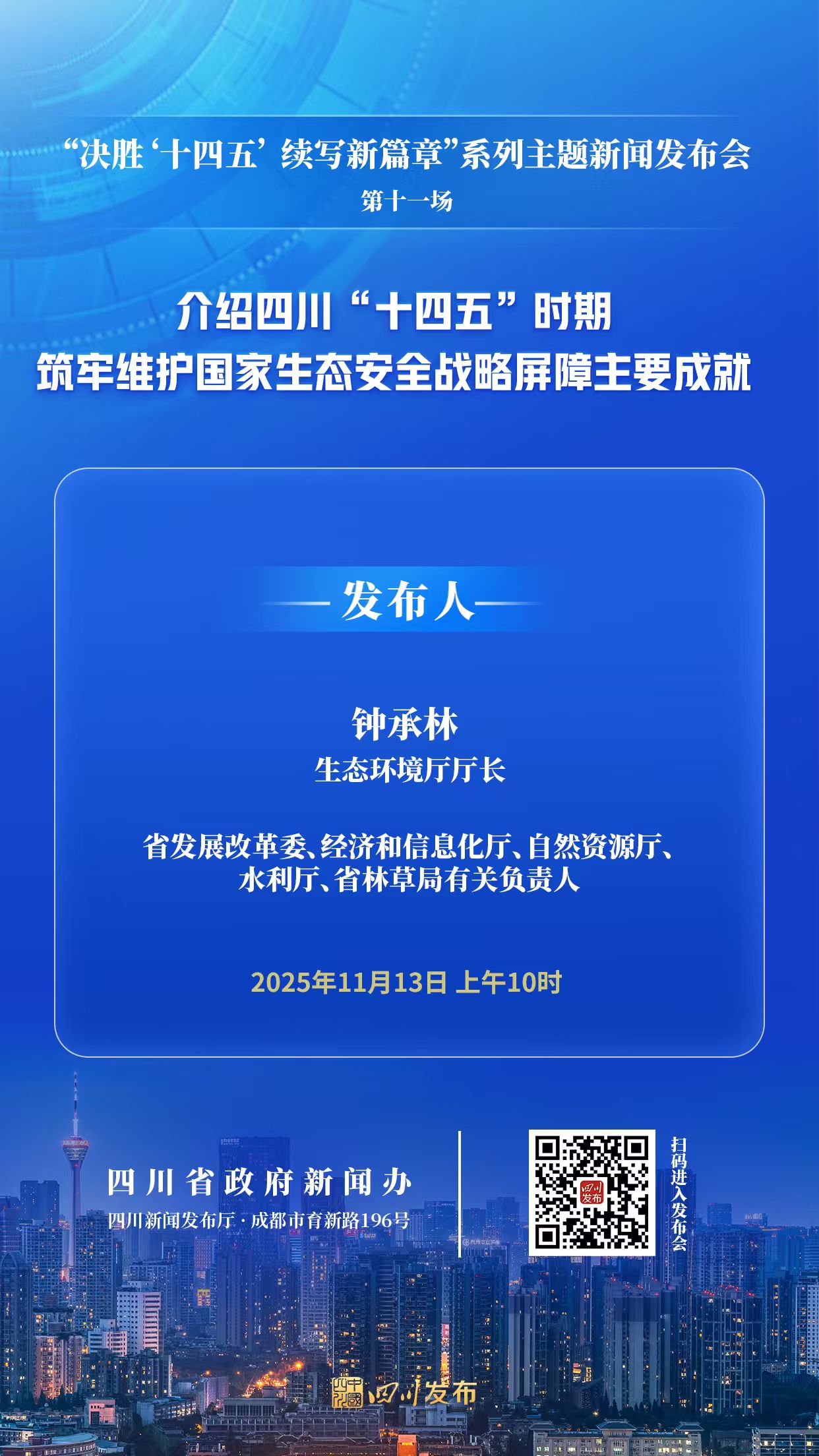 2025年11月13日(星期四)10:00,省政府新聞辦將在四川新聞發(fā)布廳舉行“決勝‘十四五’ 續(xù)寫新篇章”系列主題新聞發(fā)布會第十一場,生態(tài)環(huán)境廳廳長鐘承林圍繞四川“十四五”時期筑牢維護國家生態(tài)安全戰(zhàn)略屏障主要成就作介紹并答記者問,省發(fā)展改革委、經濟和信息化廳、自然資源廳、水利廳、省林草局有關負責人參加答記者問。四川發(fā)布客戶端將全程圖文直播,敬請關注!