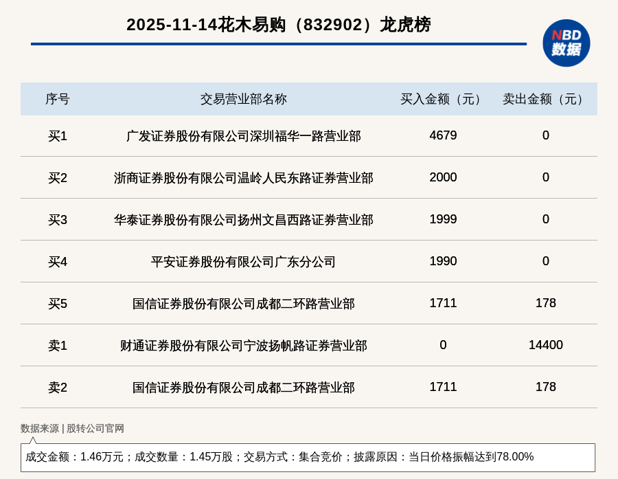 每經(jīng)訊,2025年11月14日,新三板創(chuàng)新層公司花木易購(gòu)(832902,收盤價(jià):1元)登上龍虎榜,交易方式是集合競(jìng)價(jià),披露原因是當(dāng)日價(jià)格振幅達(dá)到78.00%,成交數(shù)量1.45萬(wàn)股,成交金額1.46萬(wàn)元。買一席位為廣發(fā)證券股份有限公司深圳福華一路營(yíng)業(yè)部,買入4679元;賣一席位為財(cái)通證券股份有限公司寧波揚(yáng)帆路證券營(yíng)業(yè)部,賣出1.44萬(wàn)元。