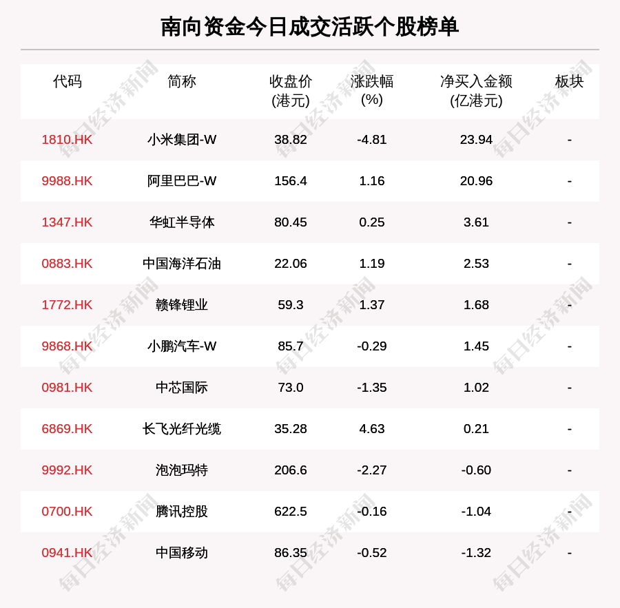 南向資金成交活躍個(gè)股榜單中,凈買入個(gè)股共8只,金額最多的是小米集團(tuán)-W(1810.HK,收盤價(jià):38.82港元),凈買入23.943億港元;凈賣出個(gè)股共3只,金額最多的是中國移動(0941.HK,收盤價(jià):86.35港元),凈賣出1.317億港元。