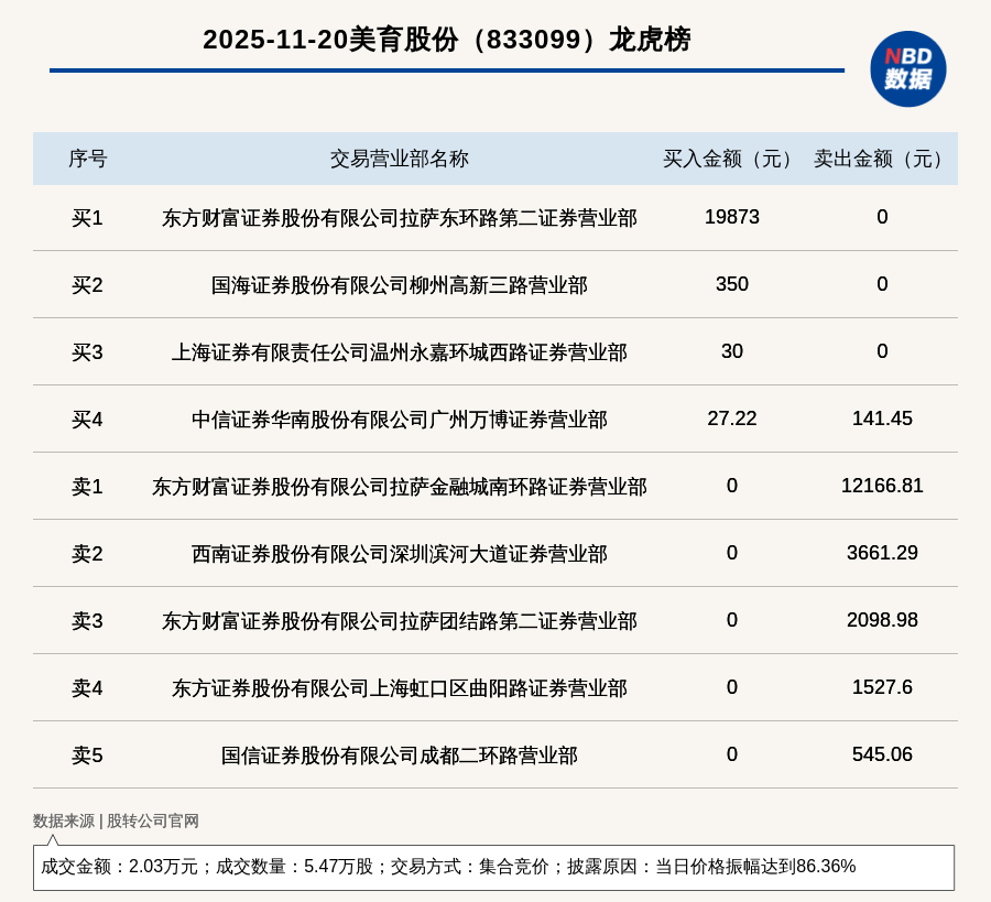 每經訊,2025年11月20日,新三板創(chuàng)新層公司美育股份(833099,收盤價:0.41元)登上龍虎榜,交易方式是集合競價,披露原因是當日價格振幅達到86.36%,成交數量5.47萬股,成交金額2.03萬元。買一席位為東方財富證券股份有限公司拉薩東環(huán)路第二證券營業(yè)部,買入1.99萬元;賣一席位為東方財富證券股份有限公司拉薩金融城南環(huán)路證券營業(yè)部,賣出1.22萬元。