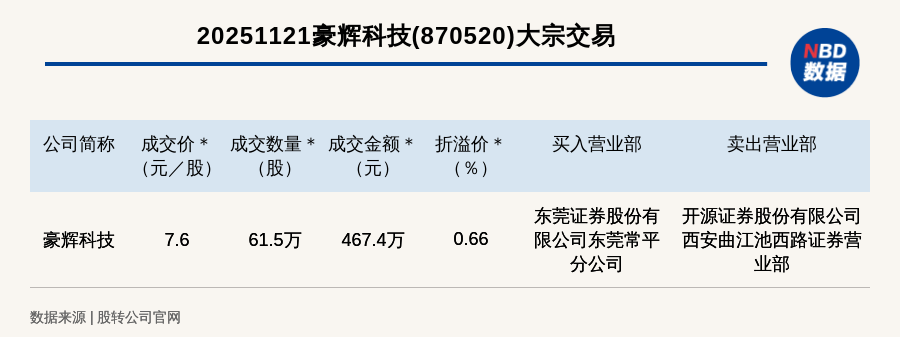 每經(jīng)訊,2025年11月21日,新三板基礎(chǔ)層公司豪輝科技(870520,收盤價(jià):7.55元)發(fā)生一筆大宗交易,成交價(jià)7.6元/股,成交數(shù)量61.5萬股,成交金額467.4萬元,溢價(jià)0.66%。買入營業(yè)部是東莞證券股份有限公司東莞常平分公司,賣出營業(yè)部是開源證券股份有限公司西安曲江池西路證券營業(yè)部。