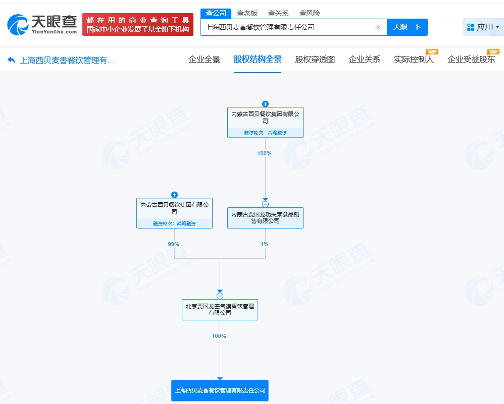 每經(jīng)AI快訊,天眼查工商信息顯示,近日,上海西貝麥香餐飲管理有限責任公司登記狀態(tài)由存續(xù)變更為注銷。該公司成立于2017年8月,法定代表人為孟德飛,注冊資本500萬元人民幣,經(jīng)營范圍包括餐飲服務(wù)、餐飲管理、會議及展覽服務(wù)等。股權(quán)全景穿透圖顯示,該公司由西貝餐飲集團旗下北京賈國龍空氣饃餐飲管理有限公司全資持股。
