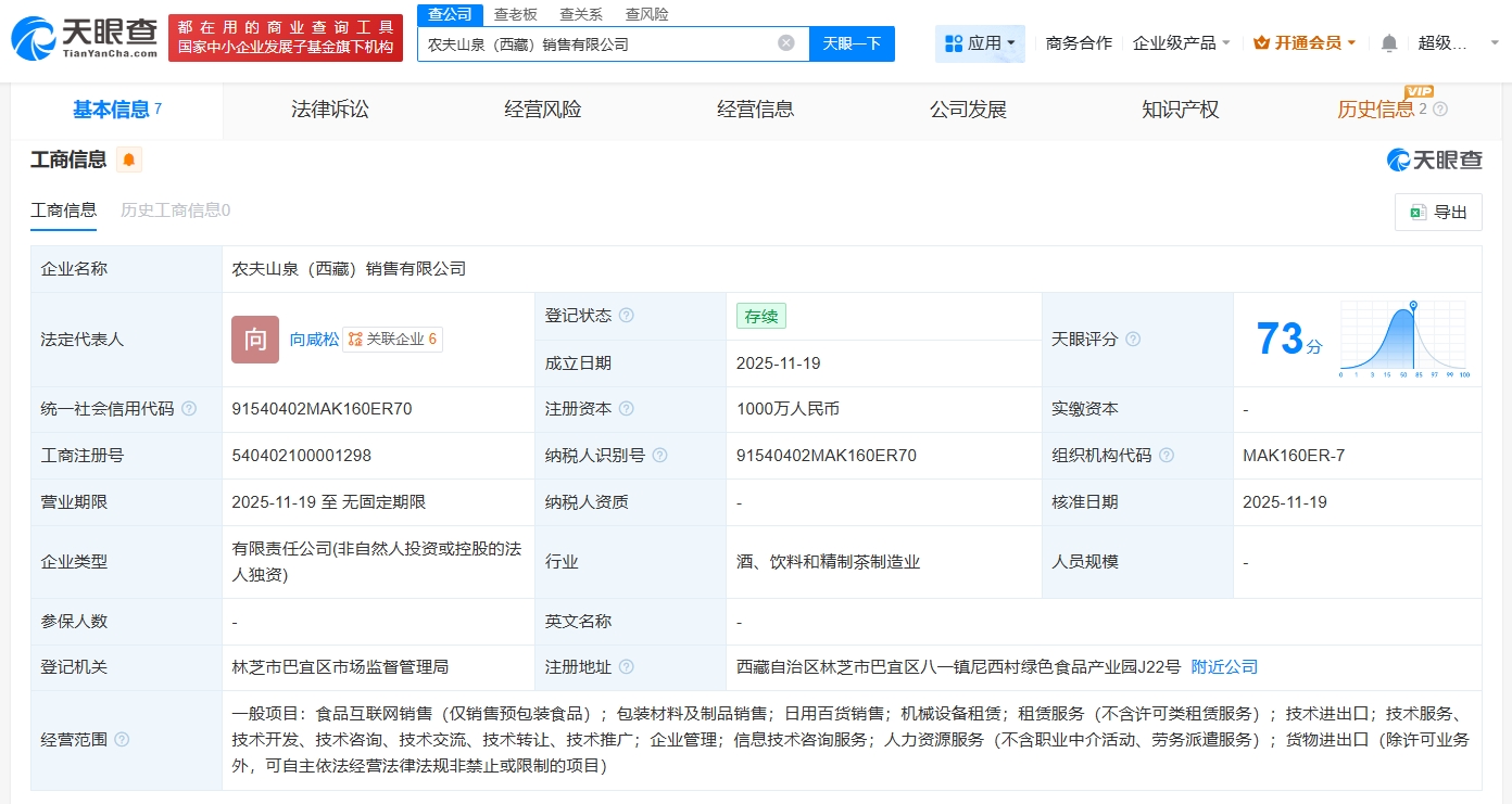 每經(jīng)AI快訊,天眼查App顯示,近日,農(nóng)夫山泉(西藏)銷售有限公司成立,法定代表人為向咸松,注冊資本1000萬元人民幣,經(jīng)營范圍包括食品互聯(lián)網(wǎng)銷售、包裝材料及制品銷售、日用百貨銷售、機(jī)械設(shè)備租賃等。股東信息顯示,該公司由農(nóng)夫山泉股份有限公司全資持股。