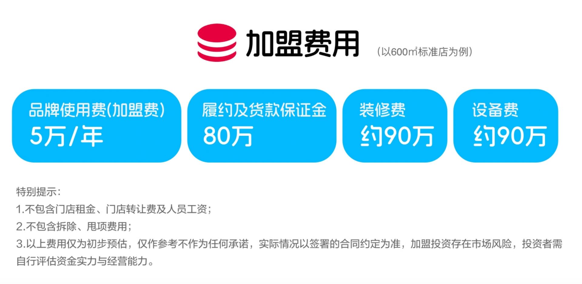 《每日經(jīng)濟(jì)新聞》記者在超盒算NB的官網(wǎng)看到,以600平方米的標(biāo)準(zhǔn)店為例,加盟費(fèi)用除了5萬(wàn)元每年的品牌使用費(fèi)(加盟費(fèi))之外,還包括80萬(wàn)元的履約及貨款保證金、約90萬(wàn)元的裝修費(fèi)和約90萬(wàn)元的設(shè)備費(fèi),累計(jì)265萬(wàn)元。此外,加盟商還需要承擔(dān)門店租金、門店轉(zhuǎn)讓費(fèi)及人員工資等費(fèi)用。