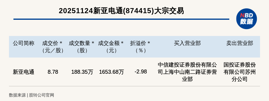 每經(jīng)訊,2025年11月24日,新三板創(chuàng)新層公司新亞電通(874415,收盤價:9.05元)發(fā)生一筆大宗交易,成交價8.78元/股,成交數(shù)量188.35萬股,成交金額1653.68萬元,折價2.98%。買入營業(yè)部是中信建投證券股份有限公司上海中山南二路證券營業(yè)部,賣出營業(yè)部是國投證券股份有限公司蘇州分公司。