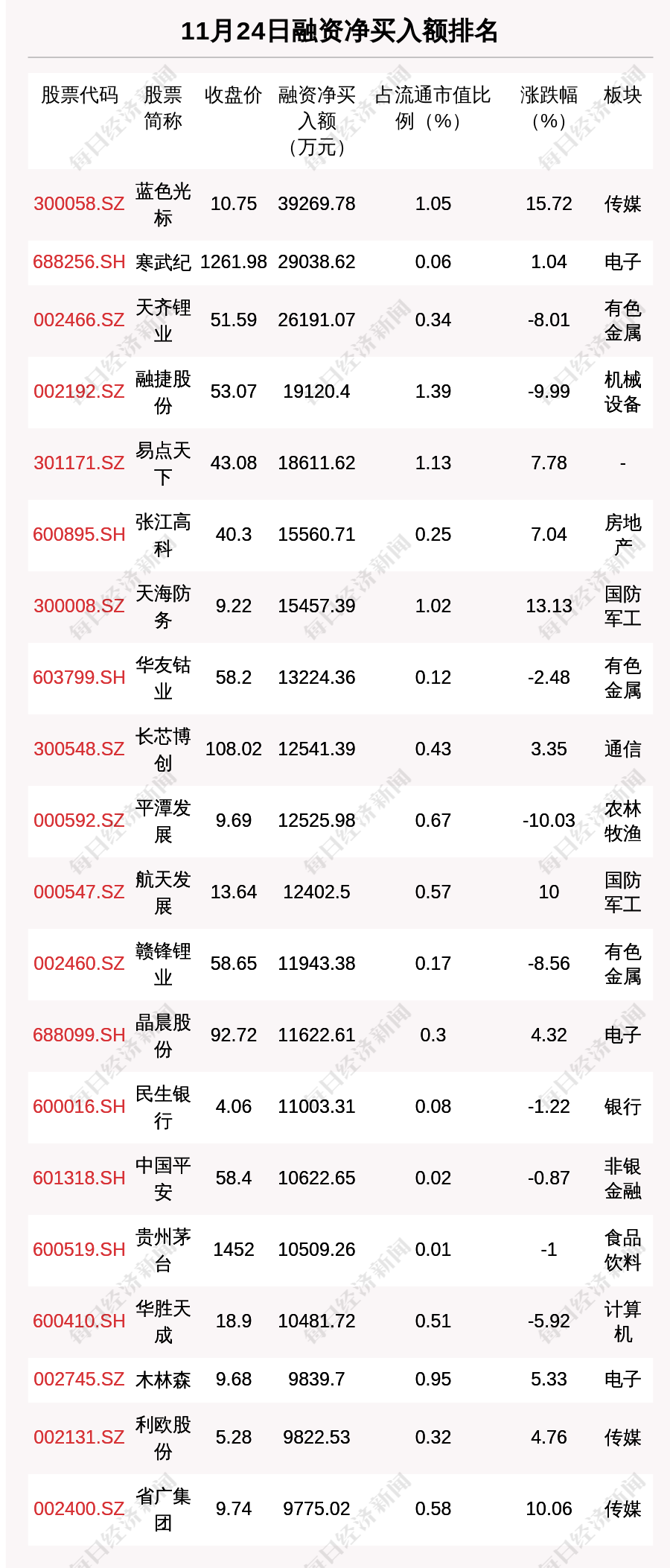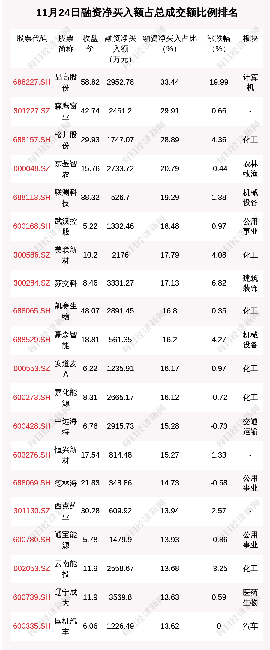 11月24日,兩市共有1622只個股有融資資金凈買入。共有53只股票融資凈買入額占總成交金額比例超10%,其中品高股份、森鷹窗業(yè)、松井股份排名前三,占比分別為33.44%、29.91%和28.89%。