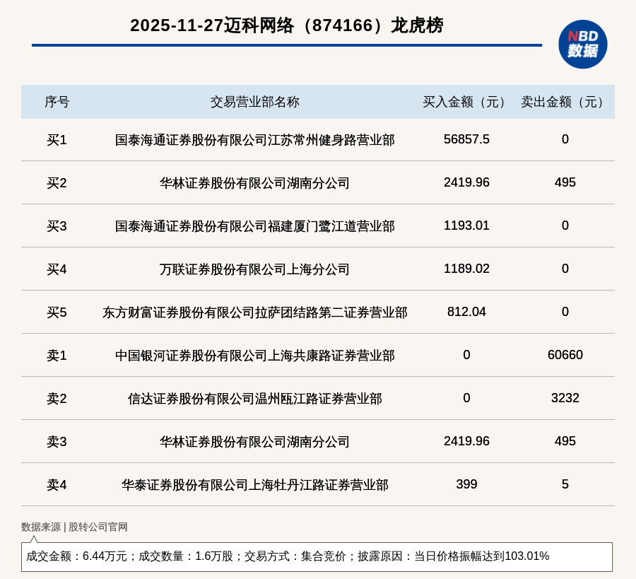 每經(jīng)訊,2025年11月27日,新三板創(chuàng)新層公司邁科網(wǎng)絡(luò)(874166,收盤價(jià):8.1元)登上龍虎榜,交易方式是集合競(jìng)價(jià),披露原因是當(dāng)日價(jià)格振幅達(dá)到103.01%,成交數(shù)量1.6萬(wàn)股,成交金額6.44萬(wàn)元。買一席位為國(guó)泰海通證券股份有限公司江蘇常州健身路營(yíng)業(yè)部,買入5.69萬(wàn)元;賣一席位為中國(guó)銀河證券股份有限公司上海共康路證券營(yíng)業(yè)部,賣出6.07萬(wàn)元。