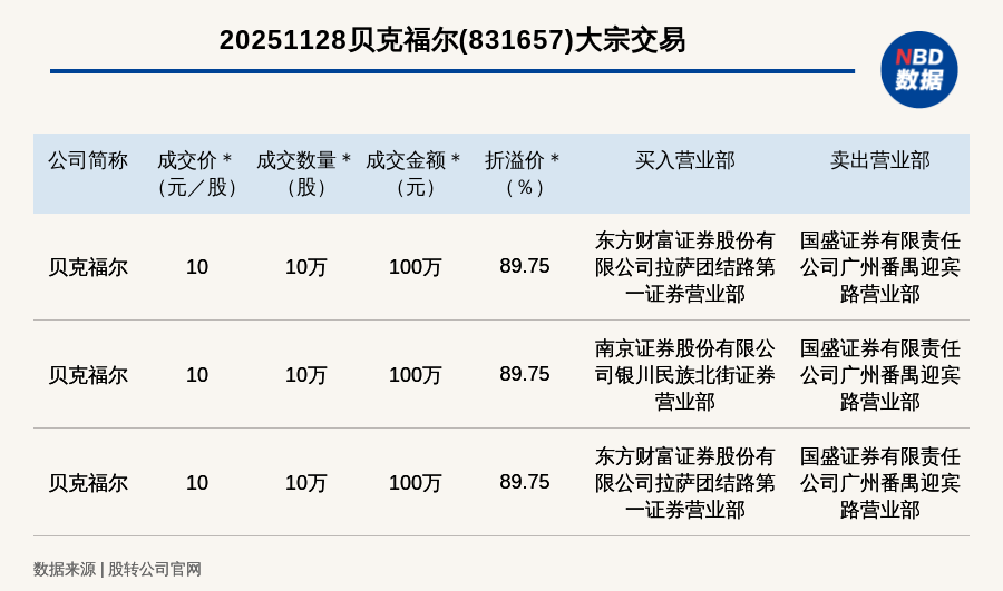 每經(jīng)訊,2025年11月28日,新三板創(chuàng)新層公司貝克福爾(831657,收盤價:5.27元)發(fā)生3筆大宗交易,總成交金額為300萬元,成交金額最高的一筆成交價10元/股,成交數(shù)量10萬股,成交金額100萬元,溢價89.75%。買入營業(yè)部是東方財富證券股份有限公司拉薩團結(jié)路第一證券營業(yè)部,賣出營業(yè)部是國盛證券有限責(zé)任公司廣州番禺迎賓路營業(yè)部。