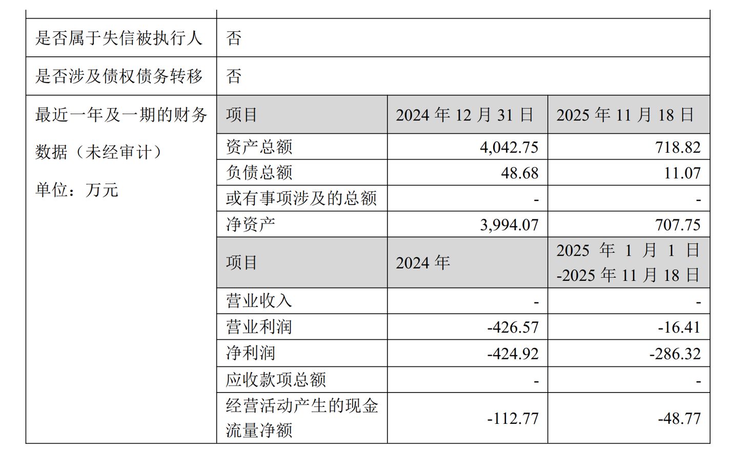 公告顯示,2024年度,萬淇泰州的營業(yè)收入為0,凈利潤(rùn)為虧損424.92萬元。進(jìn)入2025年,經(jīng)營狀況并未好轉(zhuǎn),2025年1月1日至11月18日,標(biāo)的公司的營業(yè)收入仍然為0,凈利潤(rùn)繼續(xù)虧損286.32萬元。