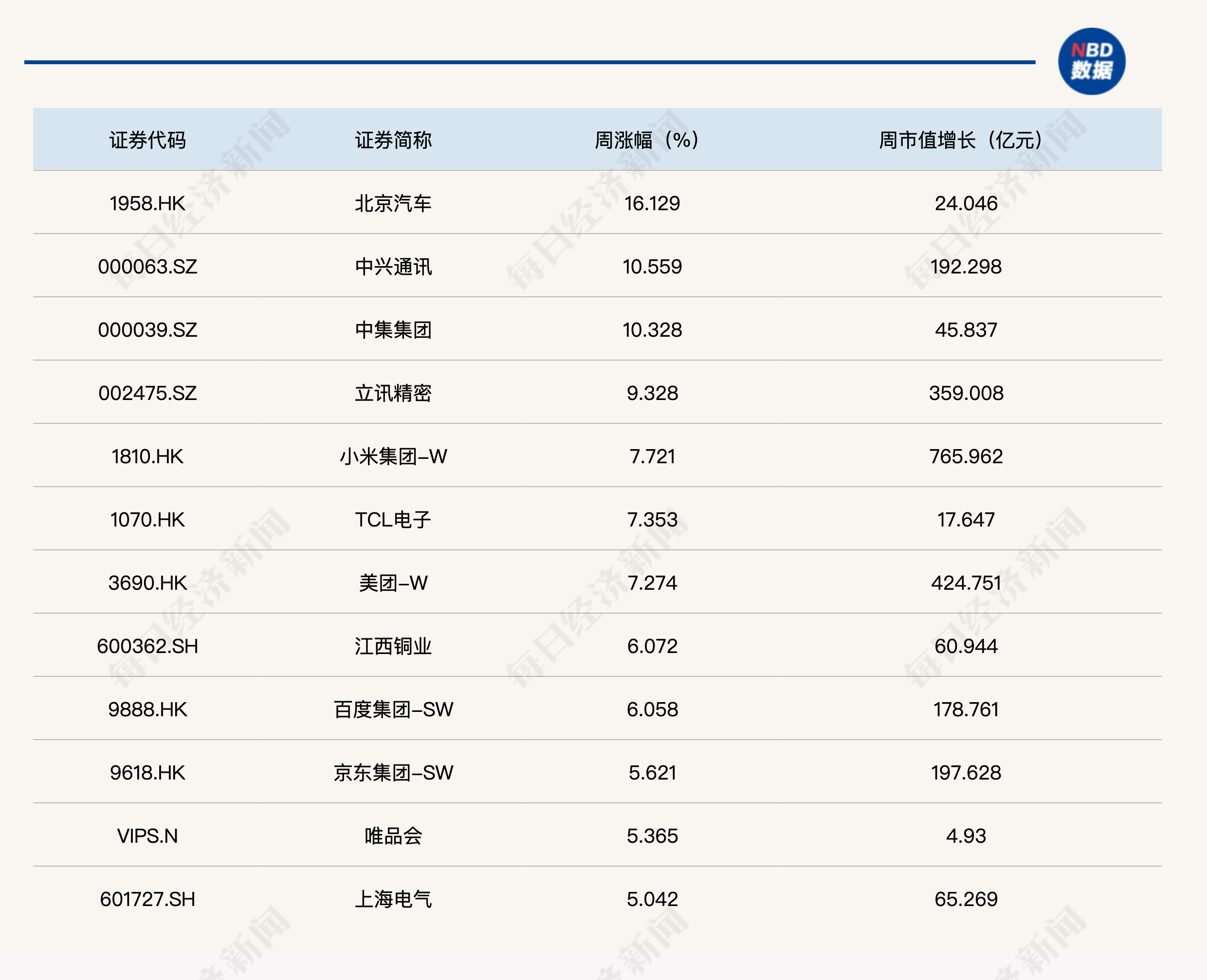 成分股方面,北京汽車周漲16.13%,周漲幅最大;中興通訊、中集集團的周漲幅均超過10%,表現(xiàn)搶眼;另外,立訊精密、小米集團-W、江西銅業(yè)以及唯品會等9只個股周漲幅也均超過5%。市值增長方面,小米集團-W和阿里巴巴-W的周市值增長均超過500億元。
