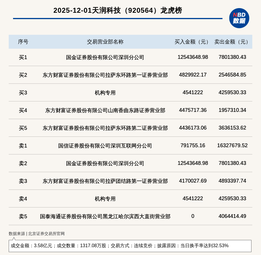 每經(jīng)訊,2025年12月1日,北交所上市公司天潤(rùn)科技(920564,收盤價(jià):25.3元)登上龍虎榜,交易方式是連續(xù)競(jìng)價(jià),披露原因是當(dāng)日換手率達(dá)到32.53%,成交數(shù)量1317.08萬(wàn)股,成交金額3.58億元。買一席位為國(guó)金證券股份有限公司深圳分公司,買入1254.36萬(wàn)元;賣一席位為國(guó)信證券股份有限公司深圳互聯(lián)網(wǎng)分公司,賣出1632.77萬(wàn)元。