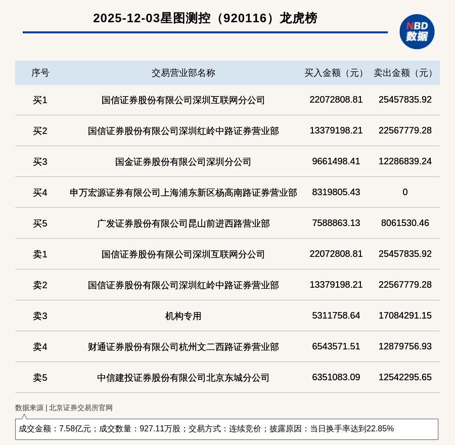 每經(jīng)訊,2025年12月3日,北交所上市公司星圖測控(920116,收盤價:77.87元)登上龍虎榜,交易方式是連續(xù)競價,披露原因是當(dāng)日換手率達到22.85%,成交數(shù)量927.11萬股,成交金額7.58億元。買一席位為國信證券股份有限公司深圳互聯(lián)網(wǎng)分公司,買入2207.28萬元;賣一席位為國信證券股份有限公司深圳互聯(lián)網(wǎng)分公司,賣出2545.78萬元。