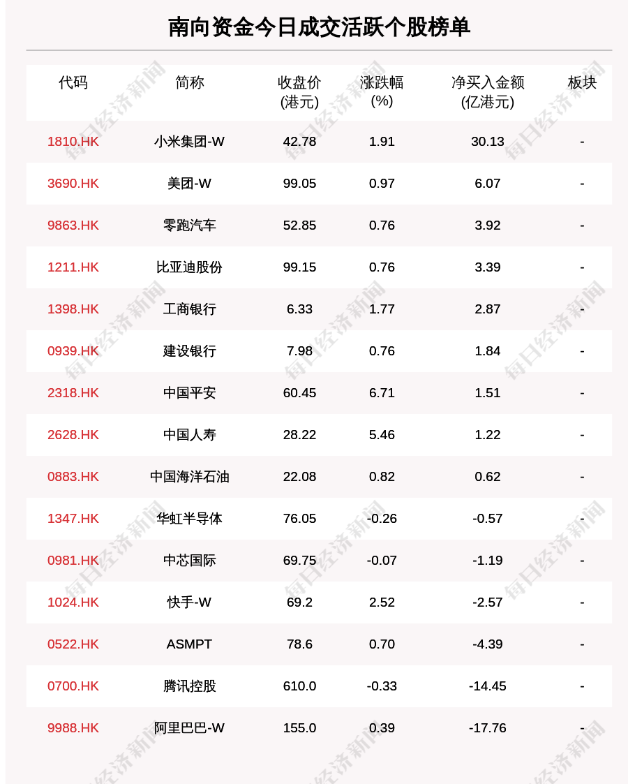 南向資金成交活躍個(gè)股榜單中,凈買入個(gè)股共9只,金額最多的是小米集團(tuán)-W(1810.HK,收盤(pán)價(jià):42.78港元),凈買入30.134億港元;凈賣出個(gè)股共6只,金額最多的是阿里巴巴-W(9988.HK,收盤(pán)價(jià):155.0港元),凈賣出17.764億港元。