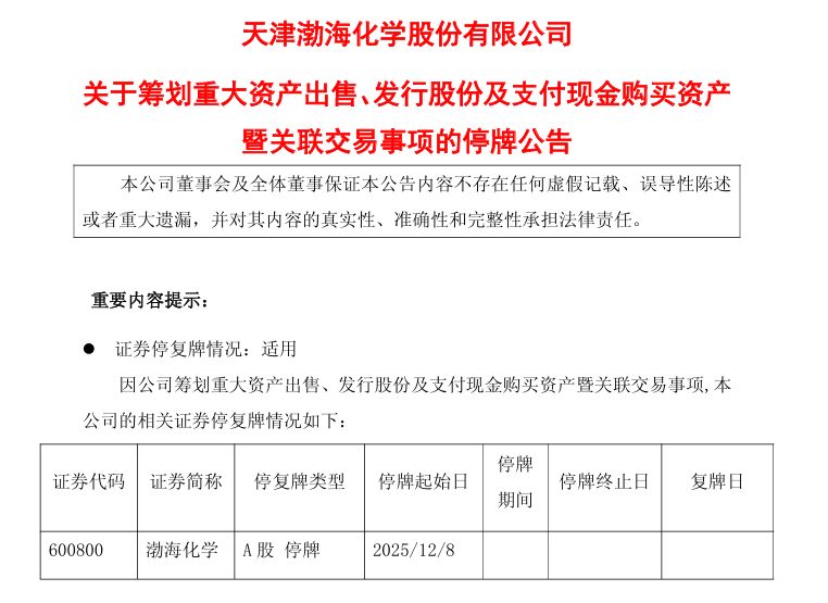 鑒于交易事項尚處于籌劃階段,有關(guān)事項存在不確定性,為避免造成股價異常波動,渤?;瘜W(xué)自2025年12月8日起開始停牌,預(yù)計停牌時間不超過10個交易日。