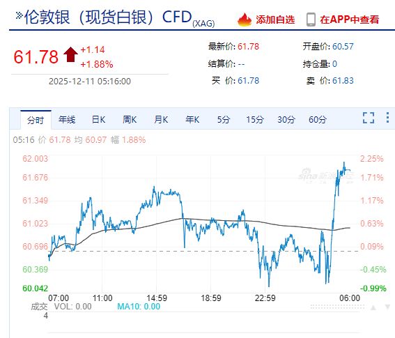 現(xiàn)貨白銀日內(nèi)漲幅近2%,報61.78美元/盎司,再創(chuàng)歷史新高。