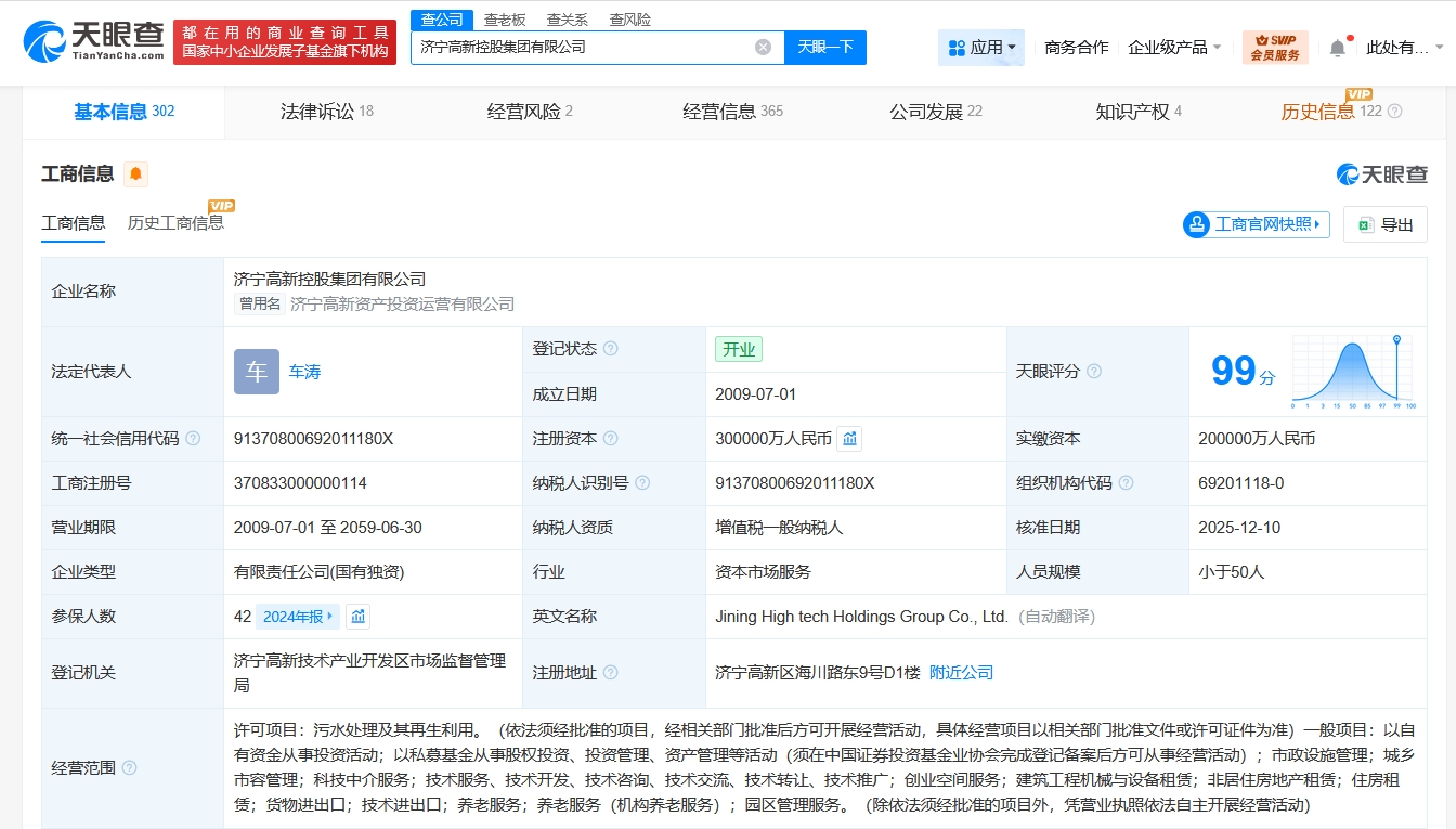 每經AI快訊,天眼查App顯示,近日,濟寧高新控股集團有限公司發(fā)生工商變更,注冊資本由20億元人民幣增至30億元人民幣,增幅50%。該公司成立于2009年7月,法定代表人為車濤,經營范圍含污水處理及其再生利用,以自有資金從事投資活動,以私募基金從事股權投資、投資管理、資產管理等活動,市政設施管理,城鄉(xiāng)市容管理等。股東信息顯示,該公司由濟寧高新技術產業(yè)開發(fā)區(qū)國有資產監(jiān)督管理局全資持股。