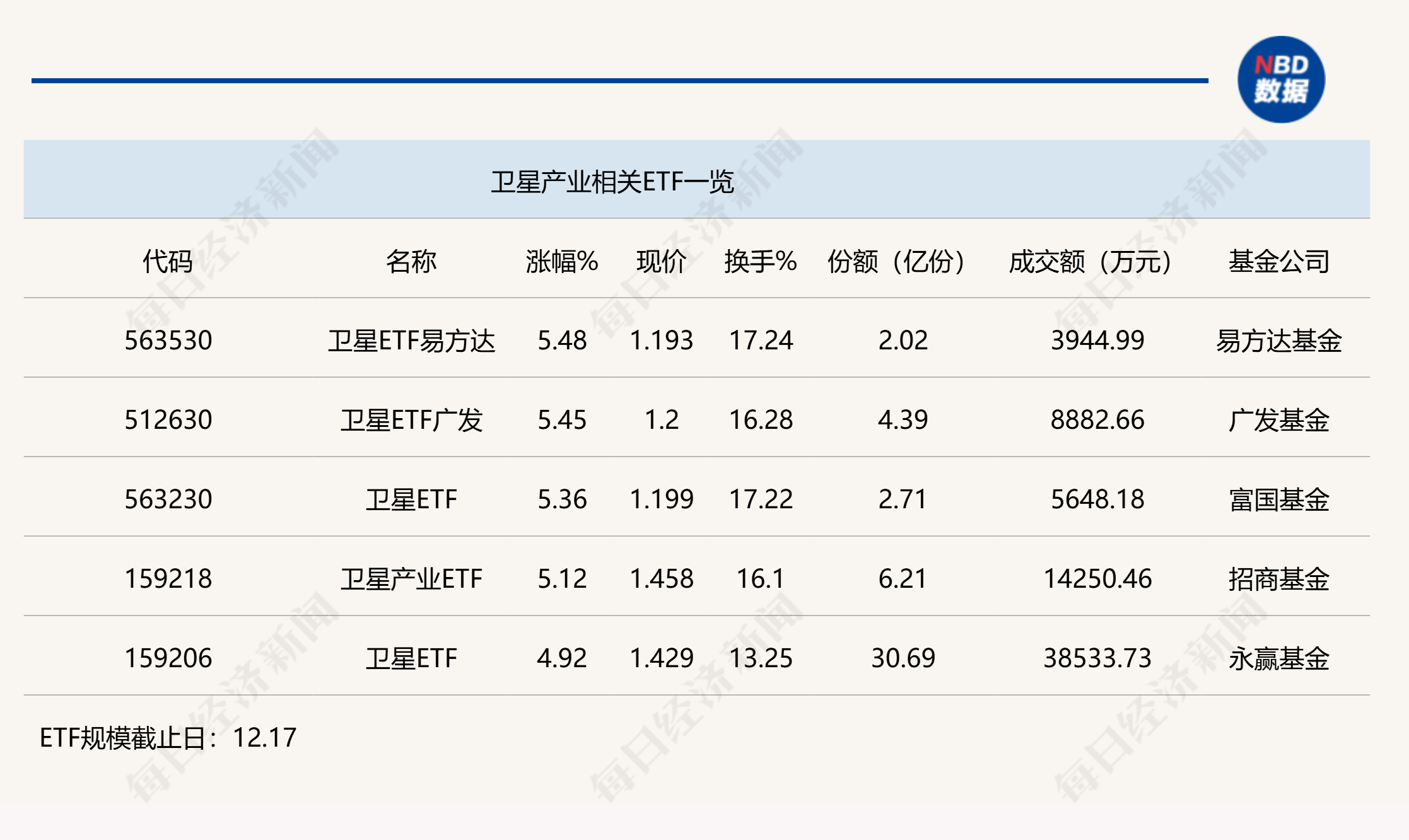 點(diǎn)評(píng):衛(wèi)星ETF易方達(dá)(563530)今日上午漲幅達(dá)到5.48%,其份額為2.02億份,半日成交金額為3945萬(wàn)元,該ETF追蹤的是中證衛(wèi)星產(chǎn)業(yè)指數(shù)。追蹤該指數(shù)的ETF還包括衛(wèi)星ETF廣發(fā)(512630)、衛(wèi)星ETF(563230)等。