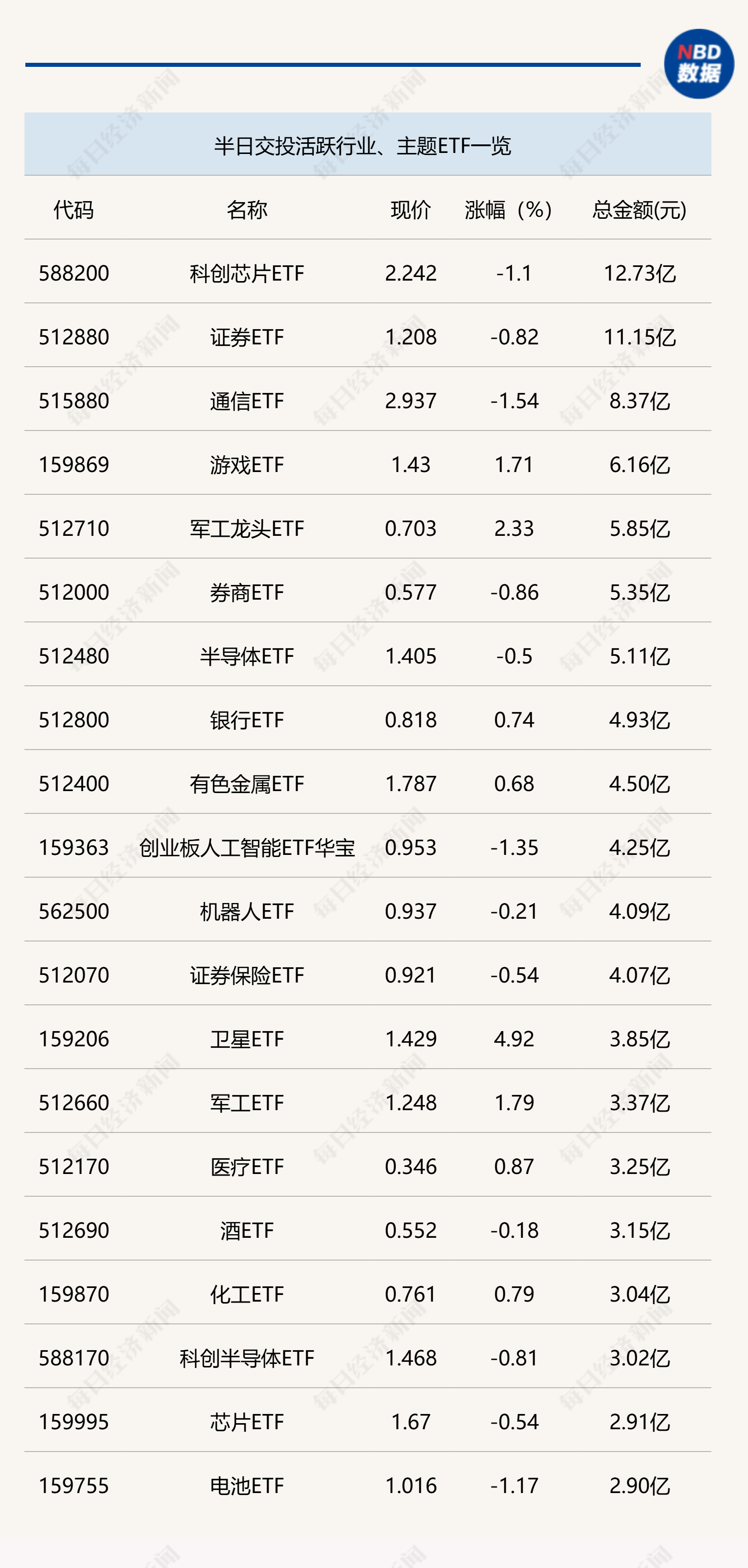 今日上午,行業(yè)、主題ETF交投稍顯平淡,僅科創(chuàng)芯片ETF(588200)和證券ETF(512800)半日成交金額超過(guò)10億元,由于衛(wèi)星主題ETF走勢(shì)強(qiáng)勁,軍工產(chǎn)業(yè)鏈相關(guān)ETF今日成交金額均有所放量??缇矱TF方面,香港證券ETF(513090)交投相對(duì)活躍,半日成交金額近50億元。