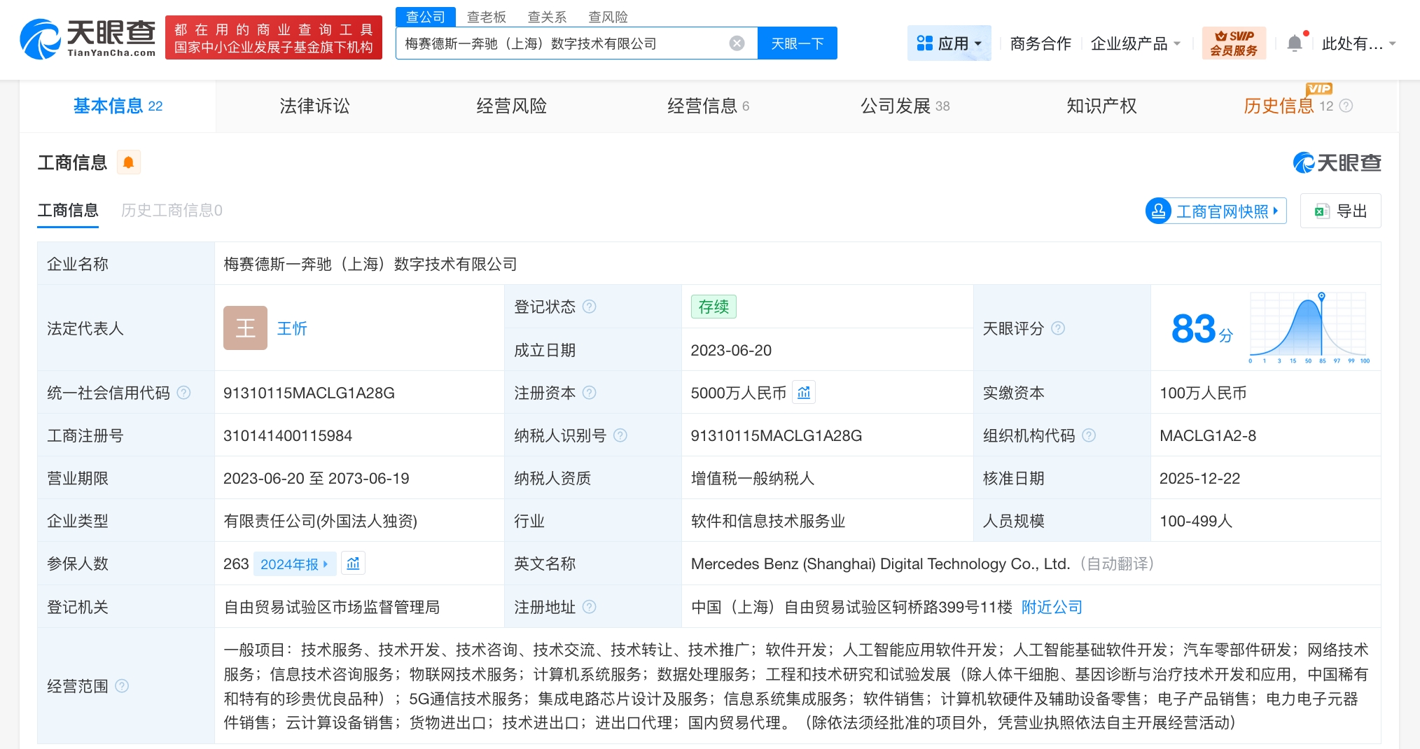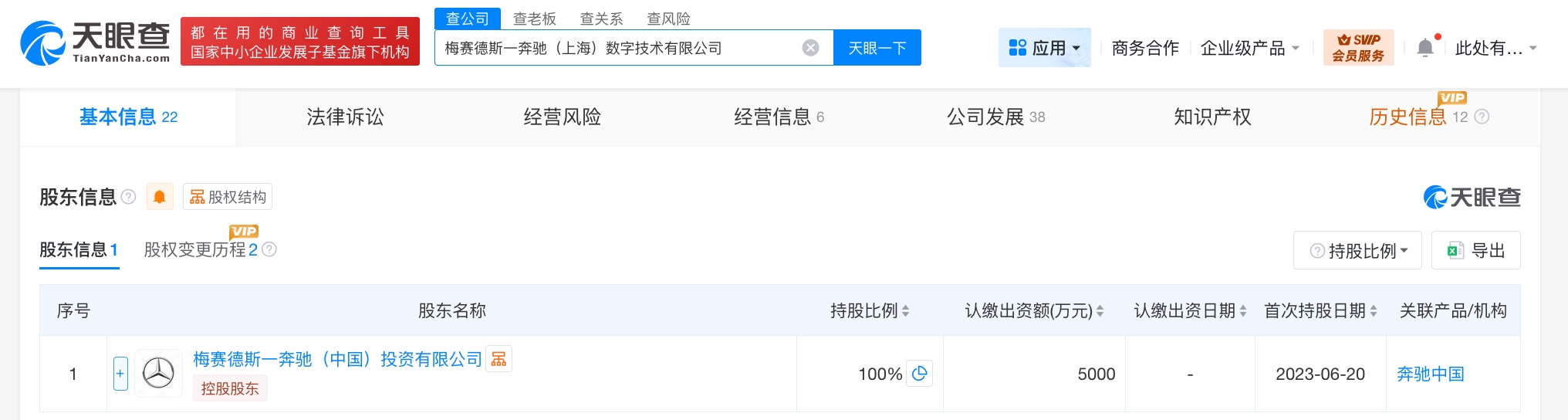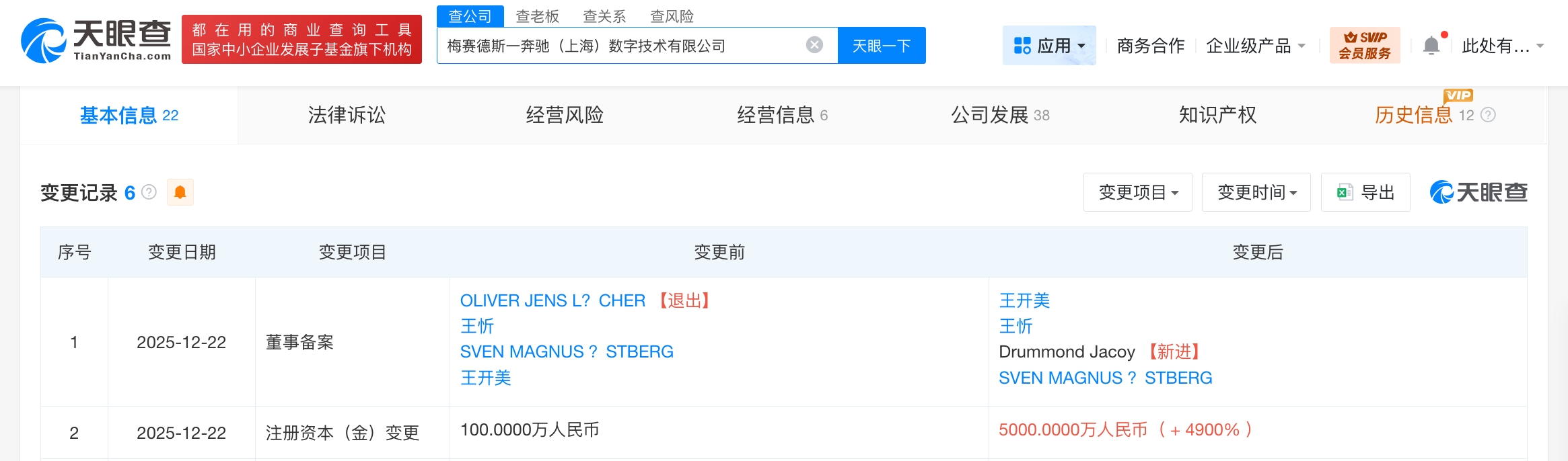 每經AI快訊,天眼查工商信息顯示,近日,梅賽德斯一奔馳(上海)數(shù)字技術有限公司發(fā)生工商變更,注冊資本由100萬元人民幣增至5000萬元人民幣,增幅4900%,同時,部分高管也發(fā)生變更。該公司成立于2023年6月,法定代表人為王忻,經營范圍含軟件開發(fā)、人工智能應用軟件開發(fā)、人工智能基礎軟件開發(fā)、汽車零部件研發(fā)、網絡技術服務、信息技術咨詢服務、物聯(lián)網技術服務、數(shù)據(jù)處理服務等。股東信息顯示,該公司由梅賽德斯一奔馳(中國)投資有限公司全資持股。
