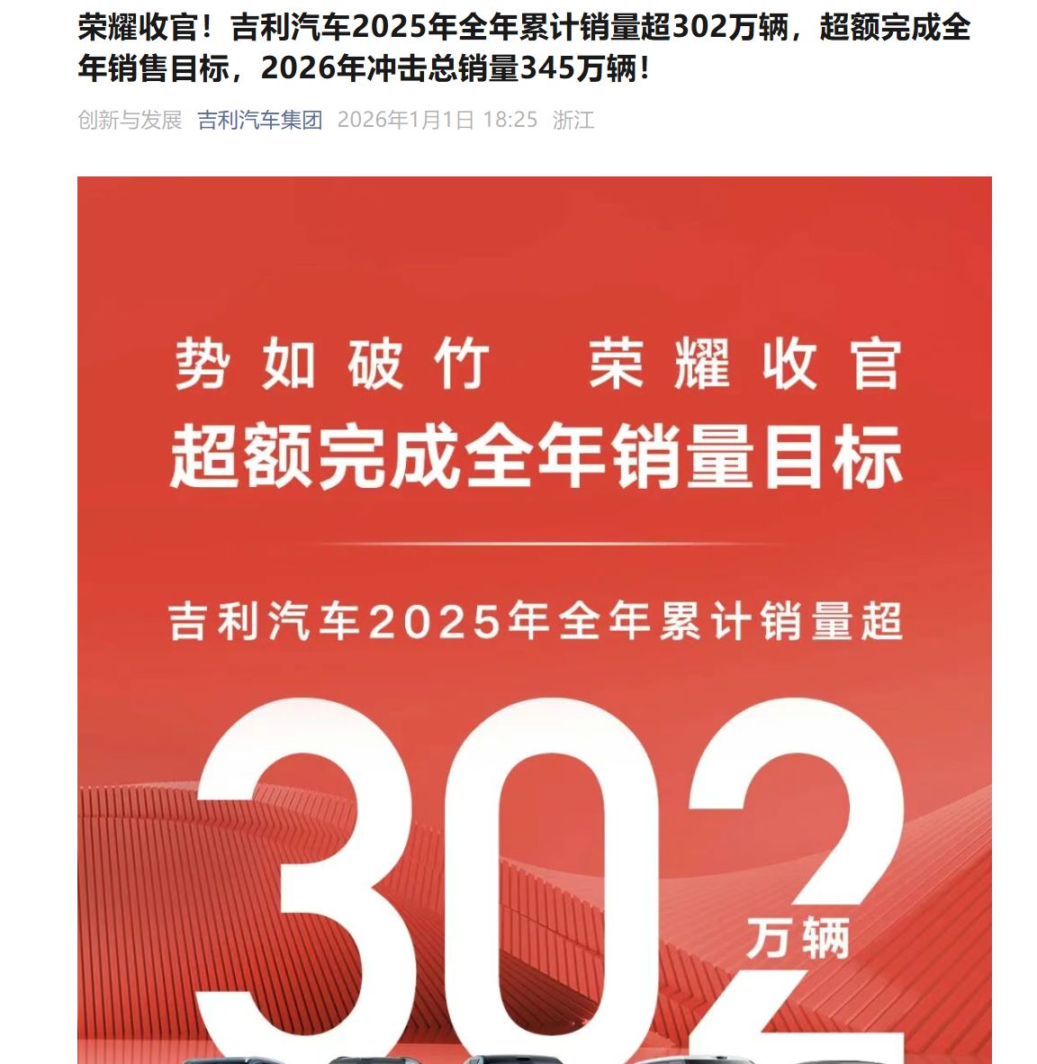 吉利汽車稱,于2025年12月的汽車總銷量為236,817部,較去年同期增長約13%;2025年全年汽車總銷量為3,024,567部,較去年同期增長約39%,并超額完成全年銷量目標(biāo)3,000,000部。