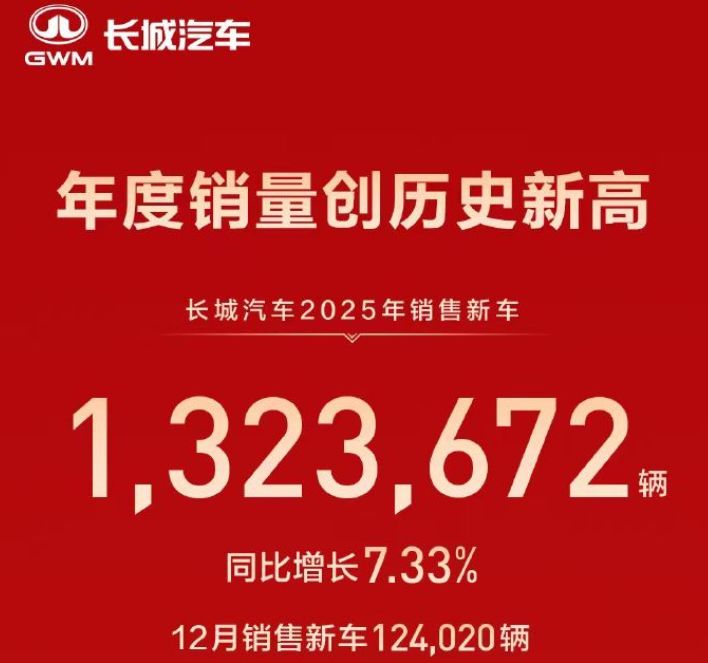 長城汽車稱, 2025年銷售新車132.37萬輛,同比增長 7.33%,再創(chuàng)歷史新高,新能源車型銷售 40.37 萬輛,同比增長 25.44%,海外銷售 50.61 萬輛,同比增長11.68%,新能源車型及海外銷量均刷新紀(jì)錄。其中,2025年12月銷量12.4萬輛。