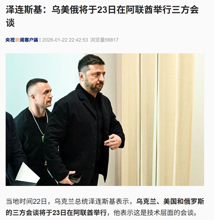 據(jù)央視新聞,當(dāng)?shù)貢r間22日,烏克蘭總統(tǒng)澤連斯基表示,烏克蘭、美國和俄羅斯的三方會談將于23日在阿聯(lián)酋舉行,他表示這是技術(shù)層面的會談。
